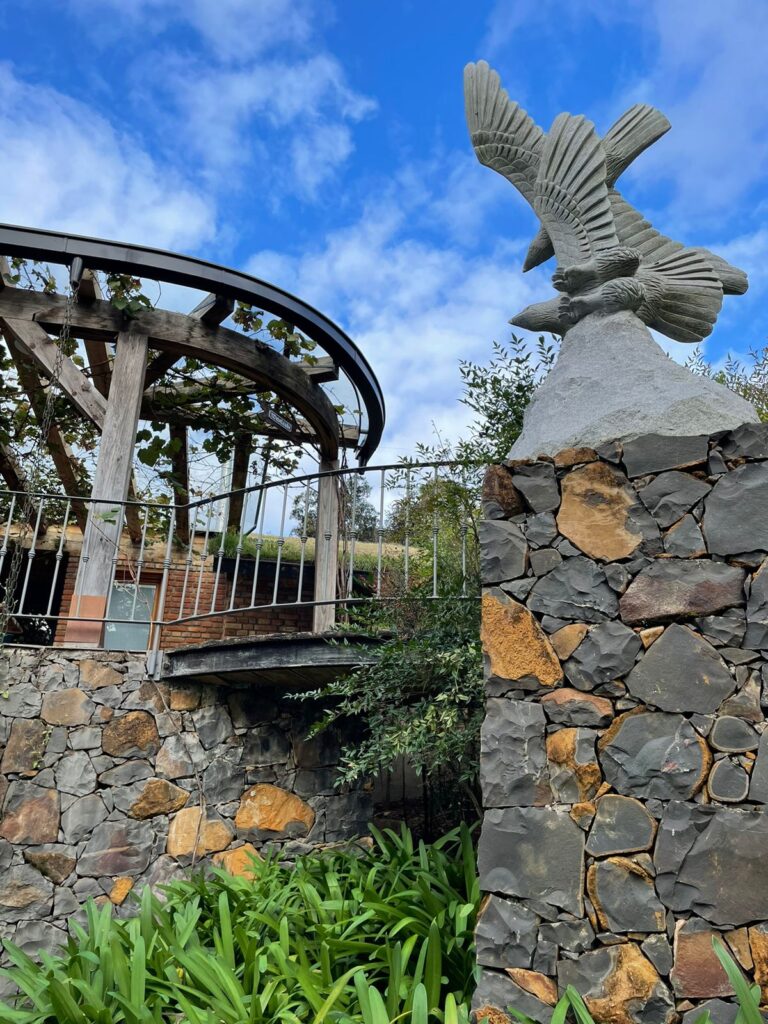 Next to the access ramp to the house and in the middle of the garden, a 1.70m-high granite work depicting two eagles flying together in a dive is installed on a stone pedestal. The work is by the German artist Herbert Andreas Pomp.