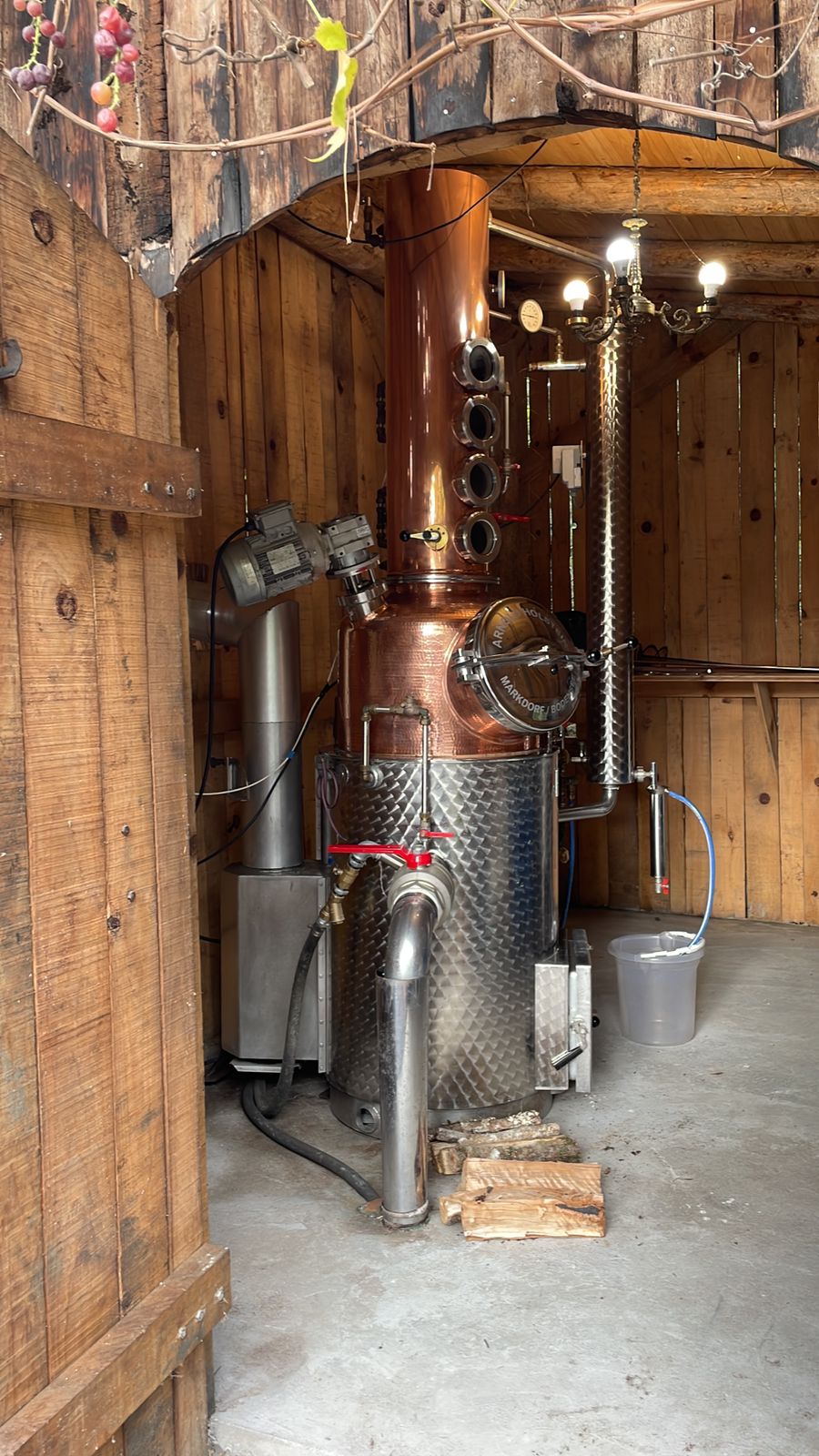 The centerpiece is a German Arnold Holstein still with a 100-liter flask and a 4-stage fractional distillation column. The peripheral equipment includes fermentation and washing accessories and measuring instruments.