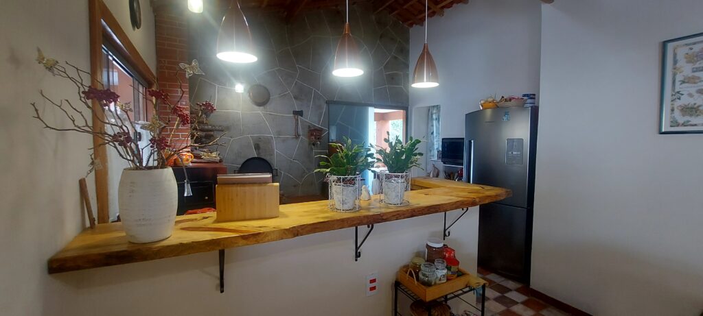 - The wall between the kitchen and the dining room has been removed and has been replace by a bar, to open up the two rooms