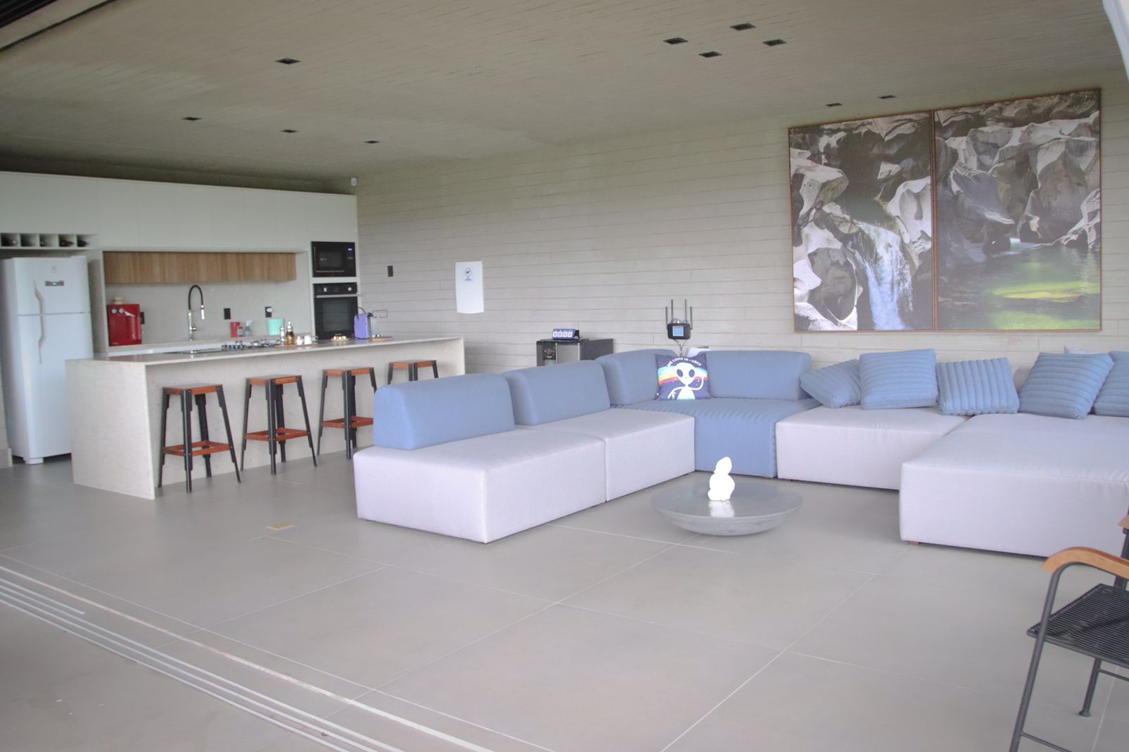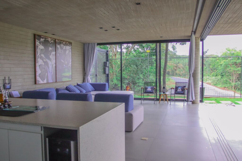The living room is modern and integrated with the kitchen. It has state-of-the-art utensils and equipment, making your stay practical.