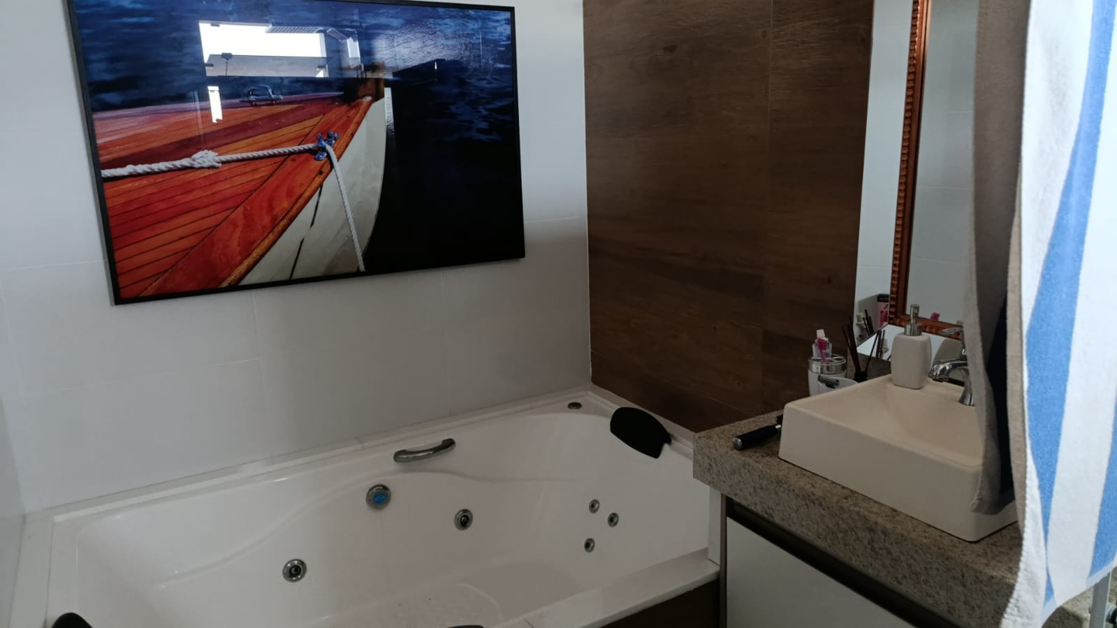 On the second floor, there are three bedrooms, one of which is a suite with a hydromassage tub and bathroom. There is another guest bathroom with a shower and a mezzanine that serves as an office.